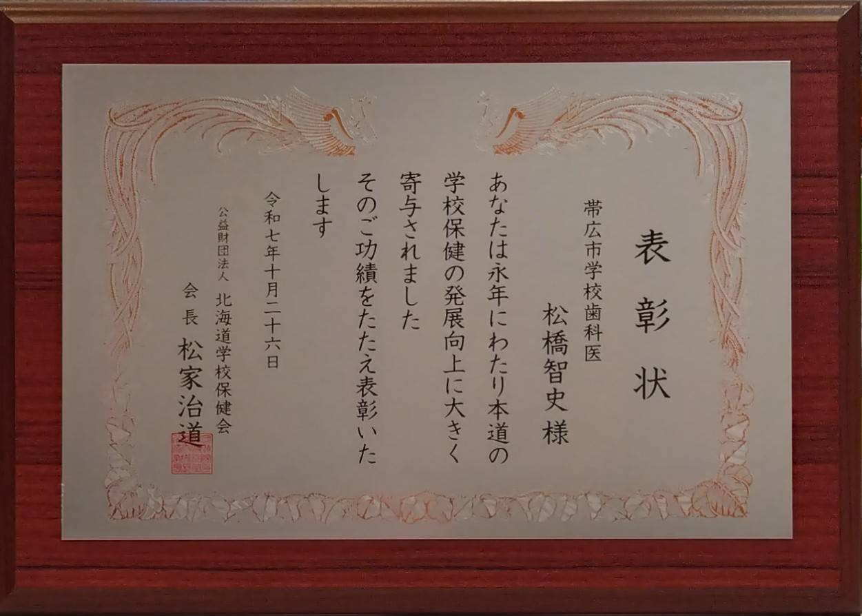 2025.10.30(Thu) 北海道学校保健会から表彰されました この度は公益財団法人・北海道学校保健会から、帯広市の市教育委員会を通じて帯広市学校歯科医として永年表彰を受けました。私も永年表彰されるほど年齢を取ったのだなと思いながら、日々、歯科医として、開業医として医療を提供していられることに改めて感謝している次第です。自分の力で生きている様で「大いなる他力に生かされている」という感覚が少しずつ芽生えてきている今日この頃です。この度の受賞を踏まえ、また気持ちを新たに取り組んでいく所存です。本日はありがとうございました。