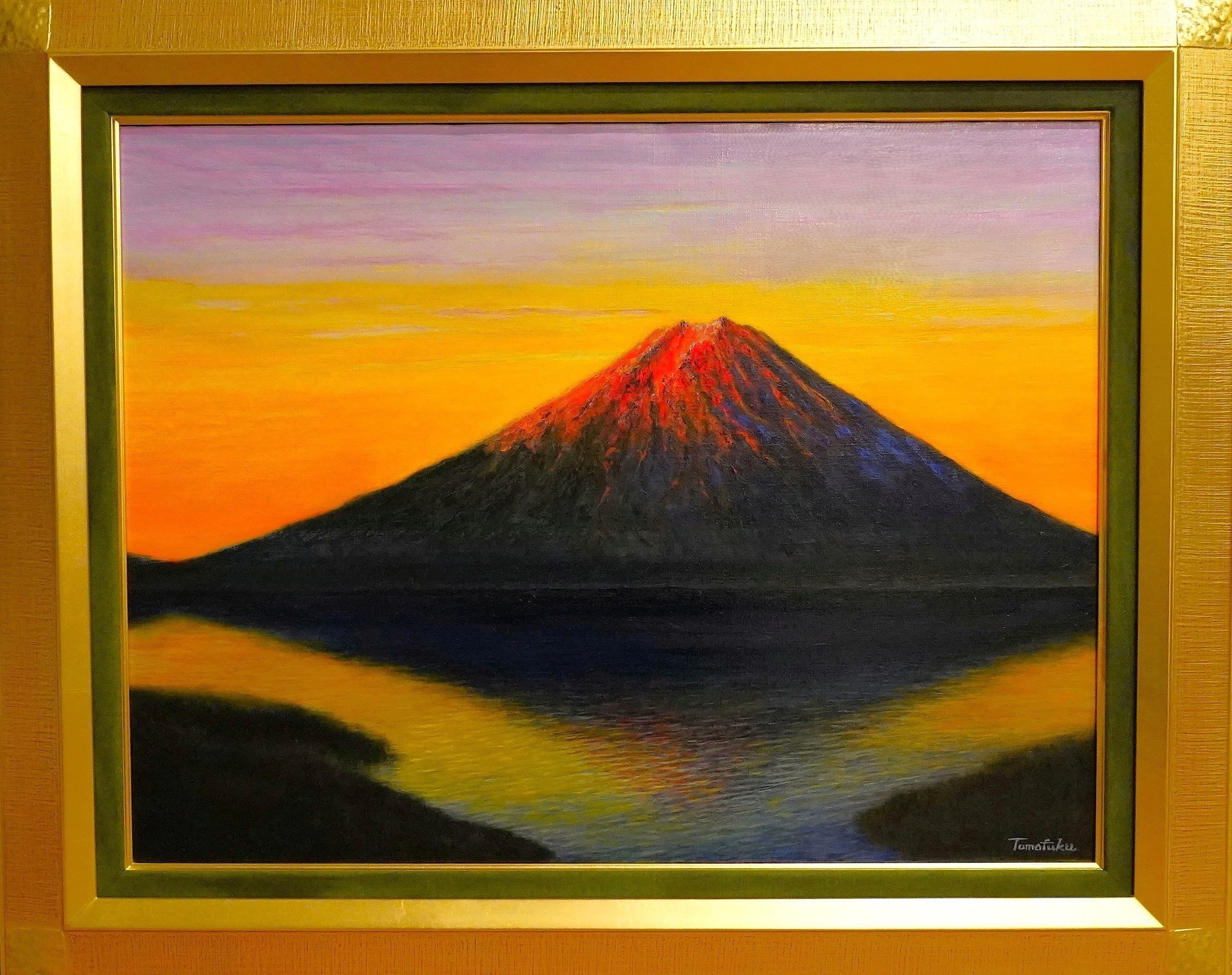 本年の展示物ですが、昨年9月に着手し、ようやく1月4日夜に描き終えました。振り返りますと2023年は兎の和凧『招福』、2024年は龍の赤版画『口福豊楽』、2025年は吉祥文字による『魚躍龍門』の水彩画を製作しましたが、本年は更なる皆様のご多幸を祈念し赤富士を油彩にて描かせて頂きました。また1990年の1年間だけ学生生活(教養学部時代)を山梨・富士吉田市で過ごし「富士山をいつか描きたい」という思いも本作につながりました。日本の象徴そして幸運シンボルである赤富士が皆様のエールとなります様に展示させて頂きます。